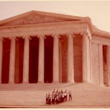 Boys, wearing blue turtlenecks, on the steps of the Thomas Jefferson Memorial