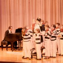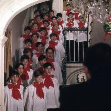 Boys wearing blue sweaters and collared shirts looking out from a stone building in Italy