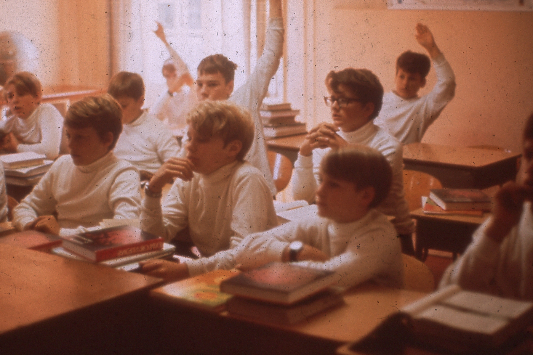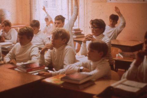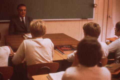 Boys wearing white turtlenecks in classroom with Mr. Graham Matheson teaching