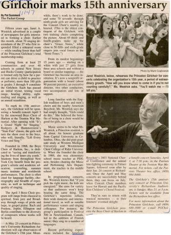 Entry Title Girlchoir marks 15th anniversary Date Thu, 04/01/2004 - 00:00 Archive Type Article Photographs Address Hillsborough Beacon Somerville, NJ United States Archive Box Number ABS-011 Add new comment Your name Email Subject Comment About text formats Restricted HTML Allowed HTML tags: <a href hreflang> <em> <strong> <cite> <blockquote cite> <code> <ul type> <ol start type> <li> <dl> <dt> <dd> <h2 id> <h3 id> <h4 id> <h5 id> <h6 id> Lines and paragraphs break automatically. Web page addresses and email addresses turn into links automatically. CAPTCHA