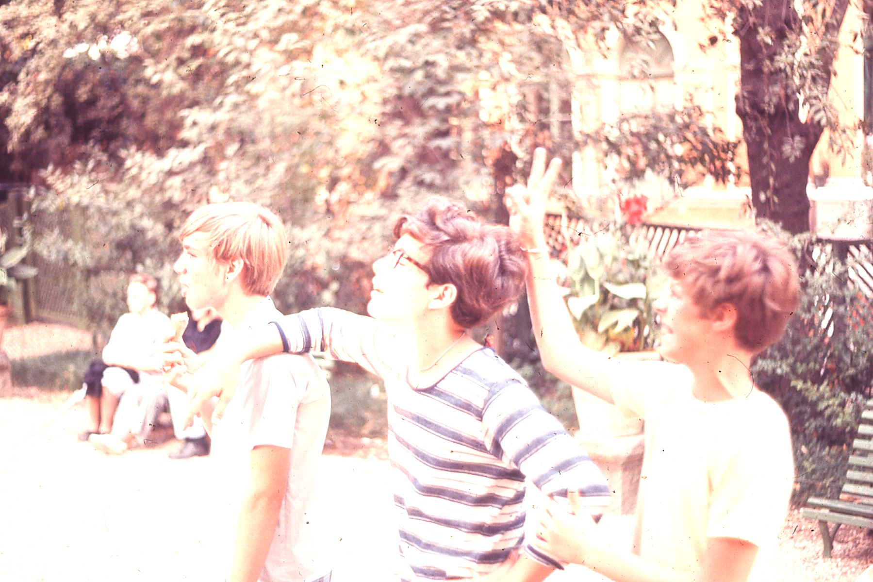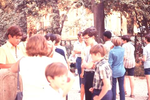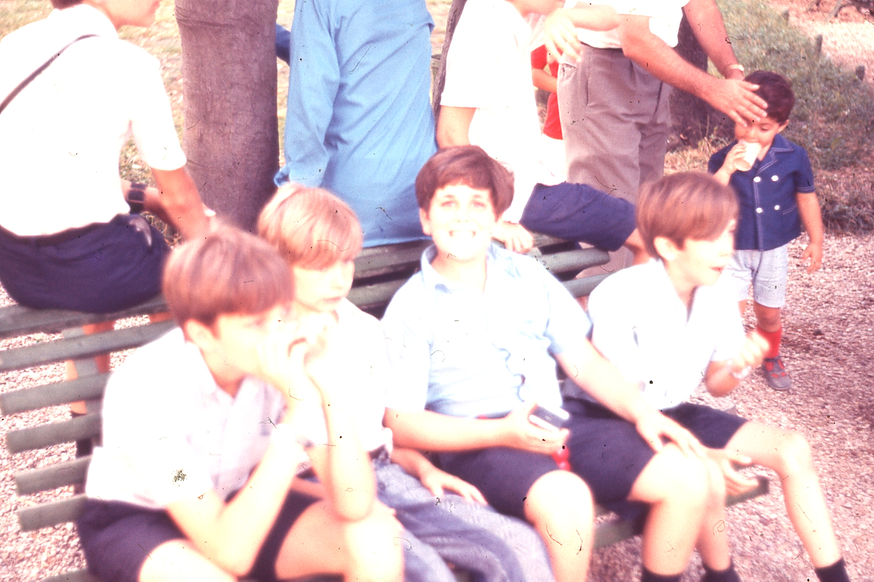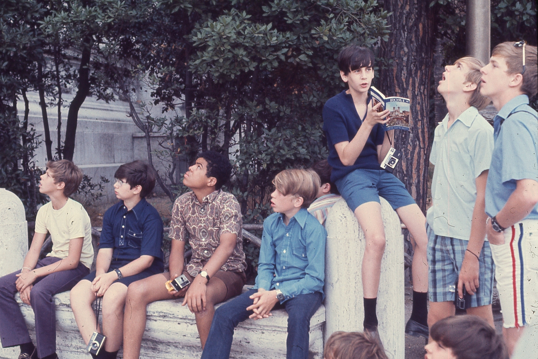 Boys, wearing white dress shirts, gathered outdoors in Italy