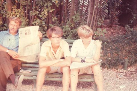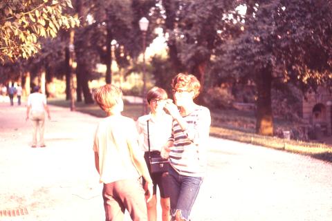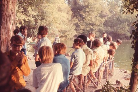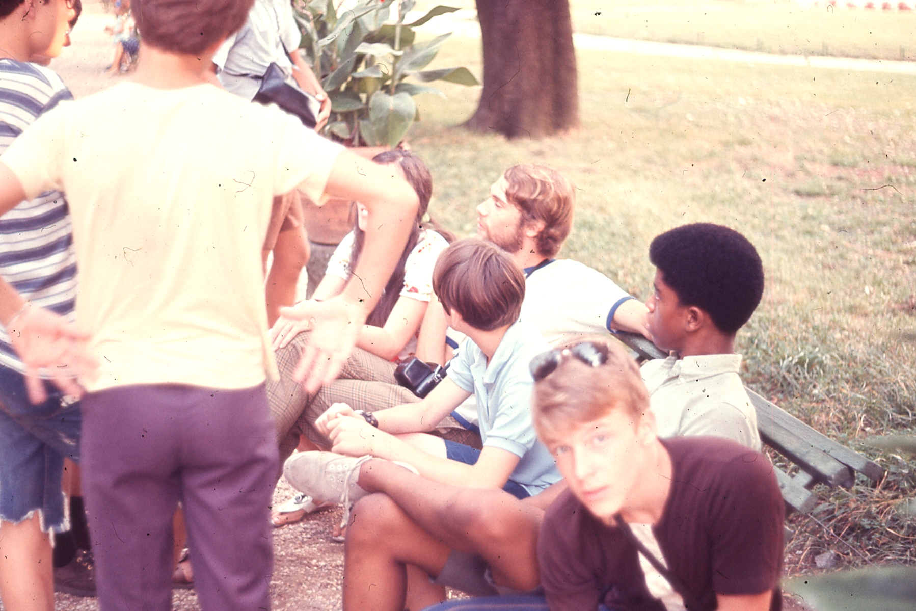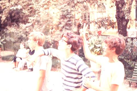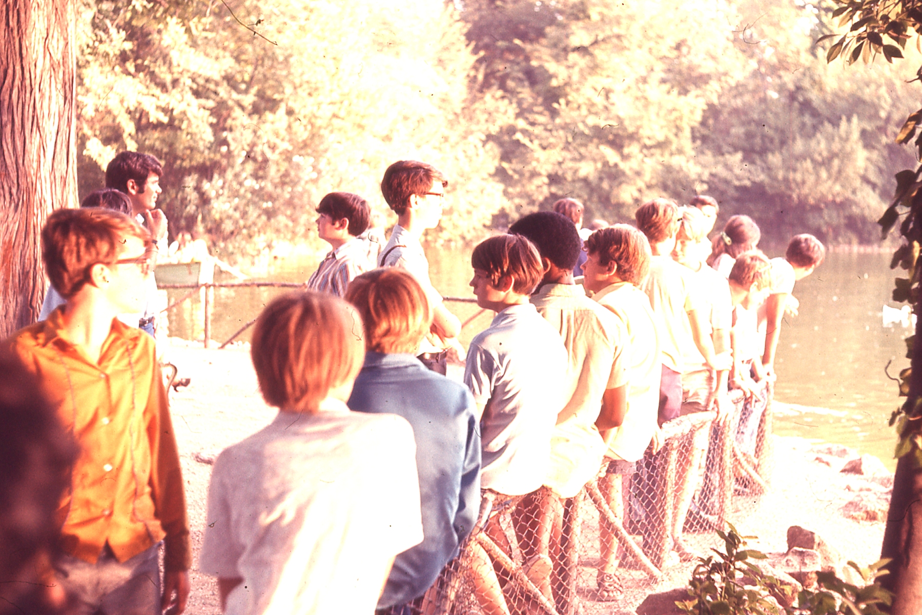 Boys, wearing white dress shirts, gathered outdoors in Italy