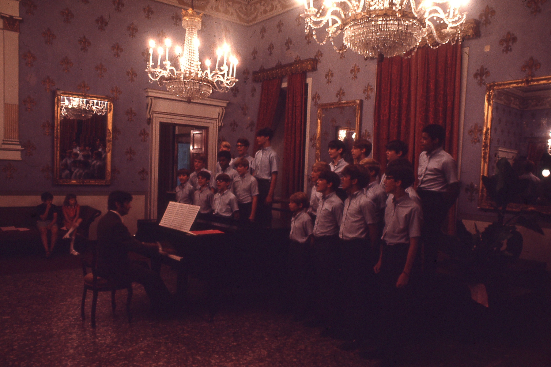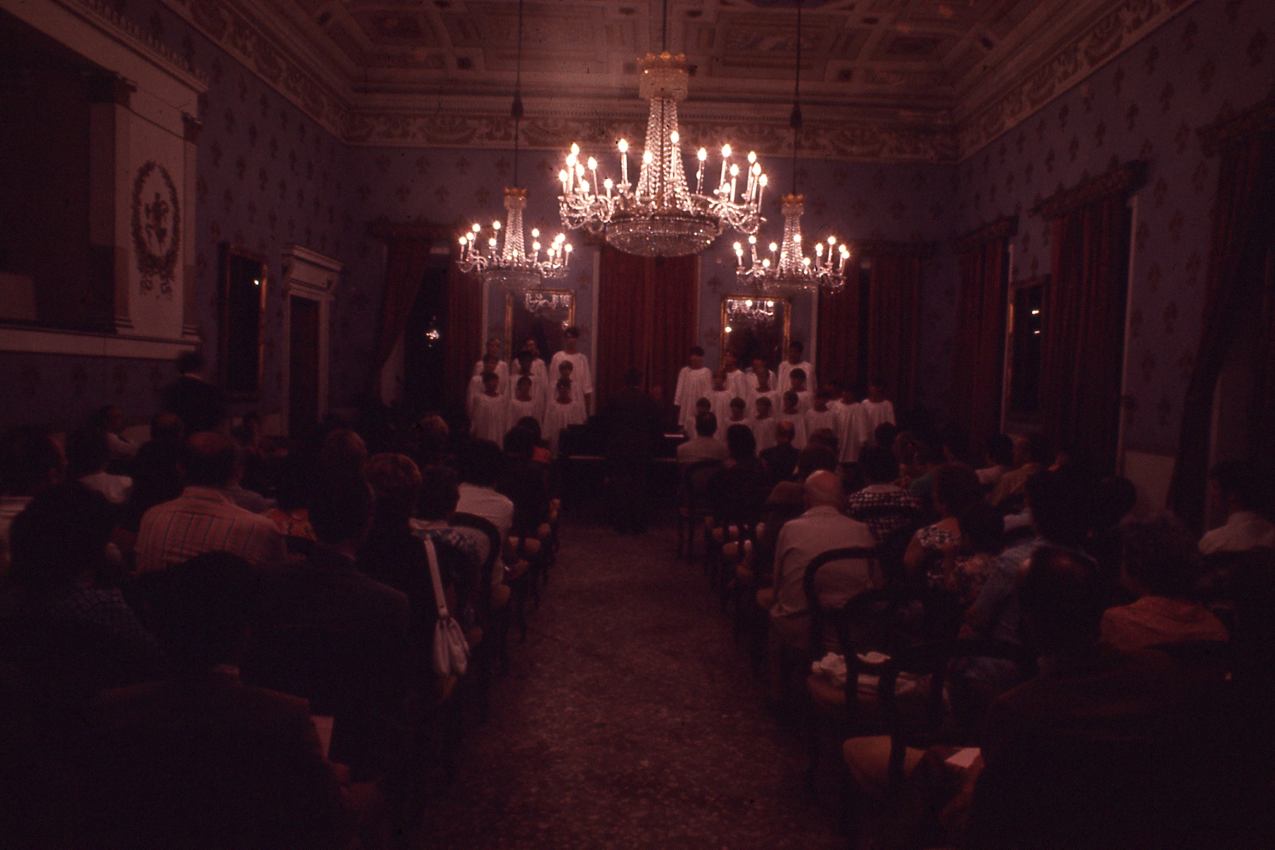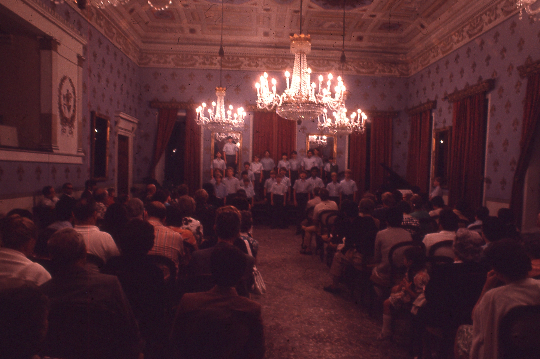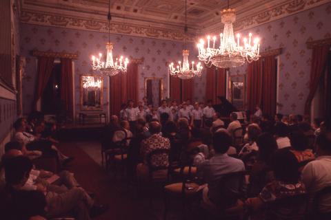 Boys performing at the Casino Municipale Ponte a Serraglio historical building located in Bagni di Lucca, Italy
