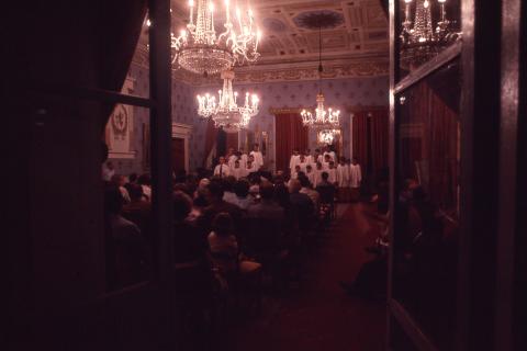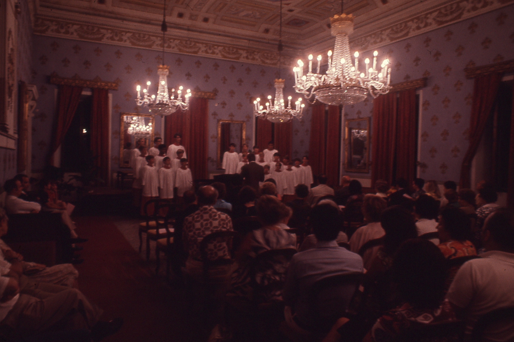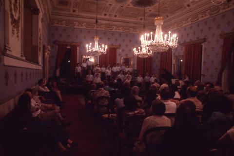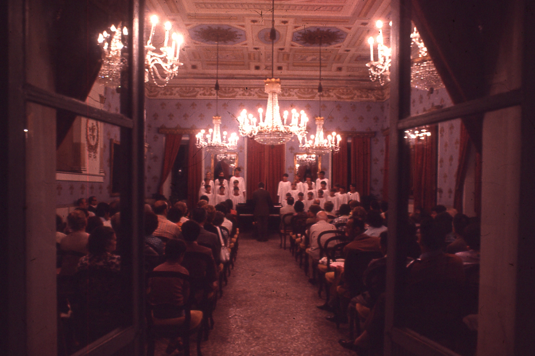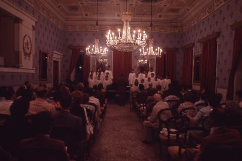 Boys performing at the Casino Municipale Ponte a Serraglio historical building located in Bagni di Lucca, Italy