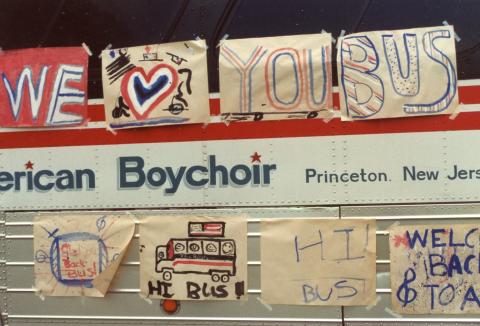 Entry Title Boys standing beside Boychoir bus which is decorated with hand-made signs Archive Type Photo Photographs Archive Box Number ABS-012 Add new comment Your name Email Subject Comment About text formats Restricted HTML Allowed HTML tags: <a href hreflang> <em> <strong> <cite> <blockquote cite> <code> <ul type> <ol start type> <li> <dl> <dt> <dd> <h2 id> <h3 id> <h4 id> <h5 id> <h6 id> Lines and paragraphs break automatically. Web page addresses and email addresses turn into links automatically. CAPTCHA
