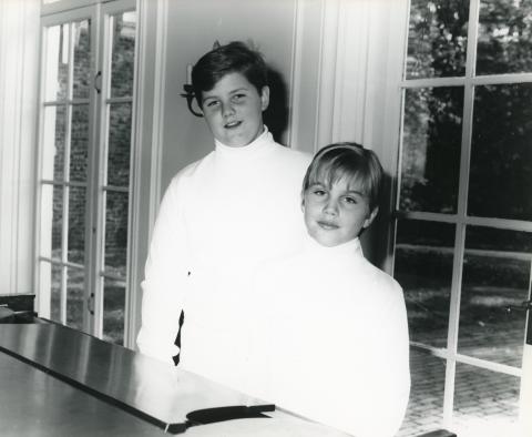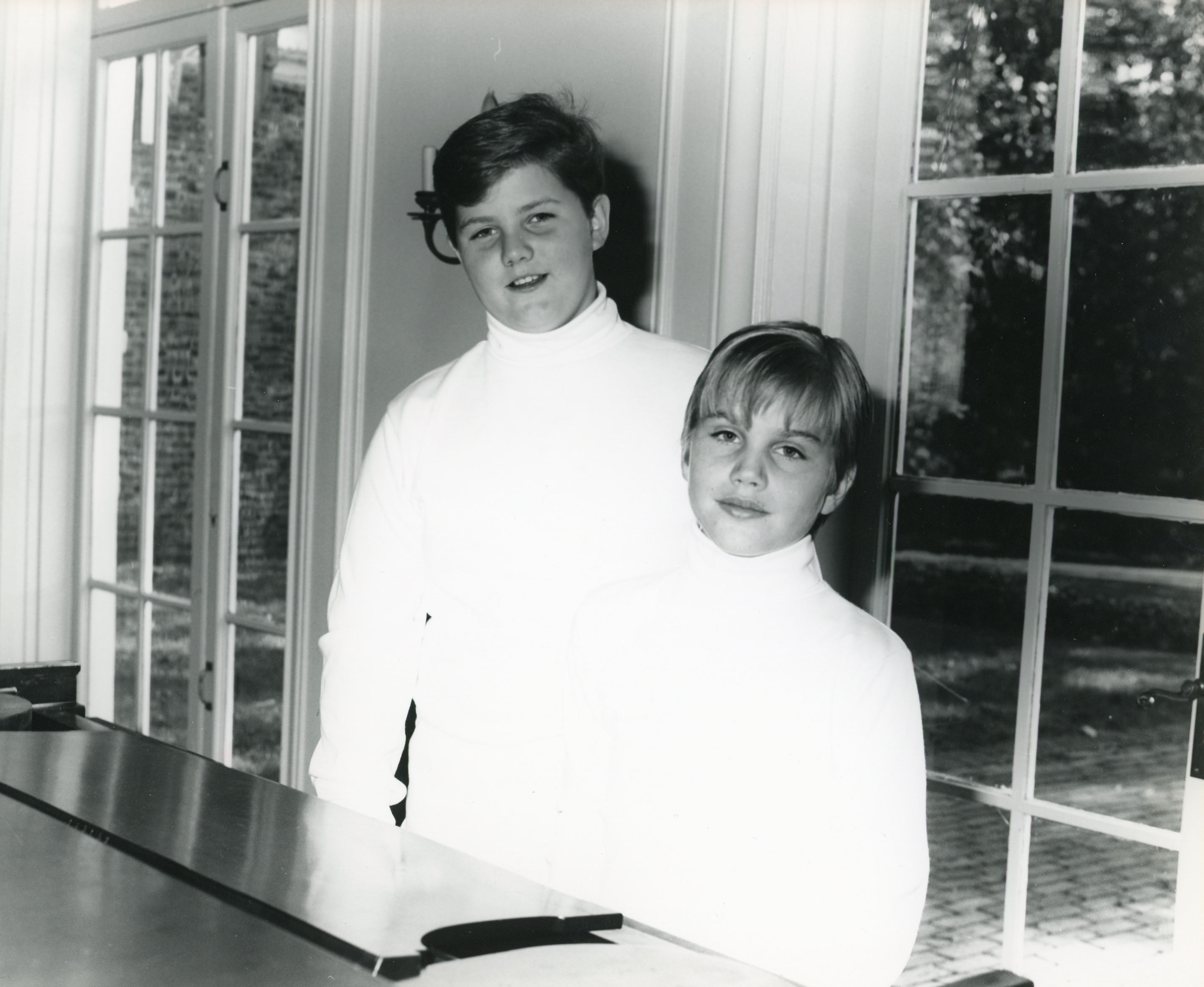 Two boys, wearing white turtlenecks, standing at a piano in Albemarle mansion