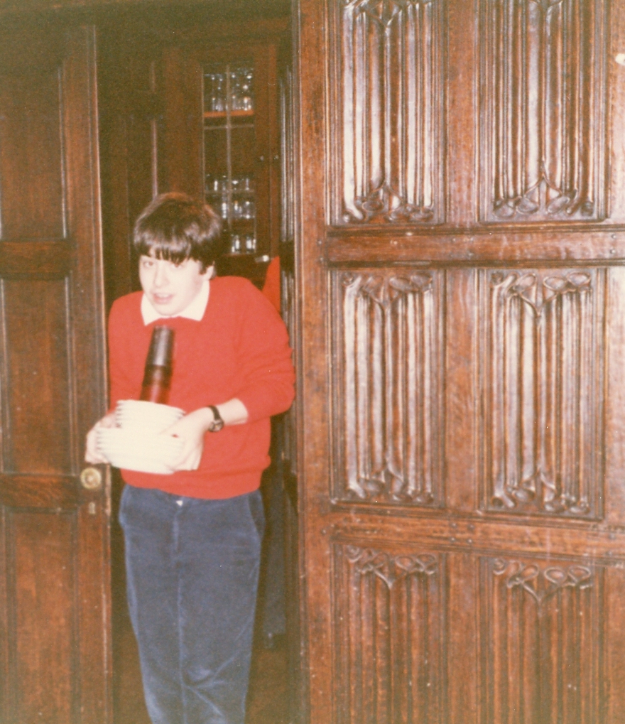 Dark-haired boy, wearing red sweater, carrying dishes