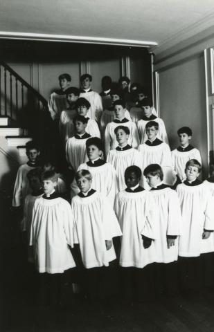 Group photo of boys, wearing vestments, assembled on the staircase in the Grand Hall of Albemarle