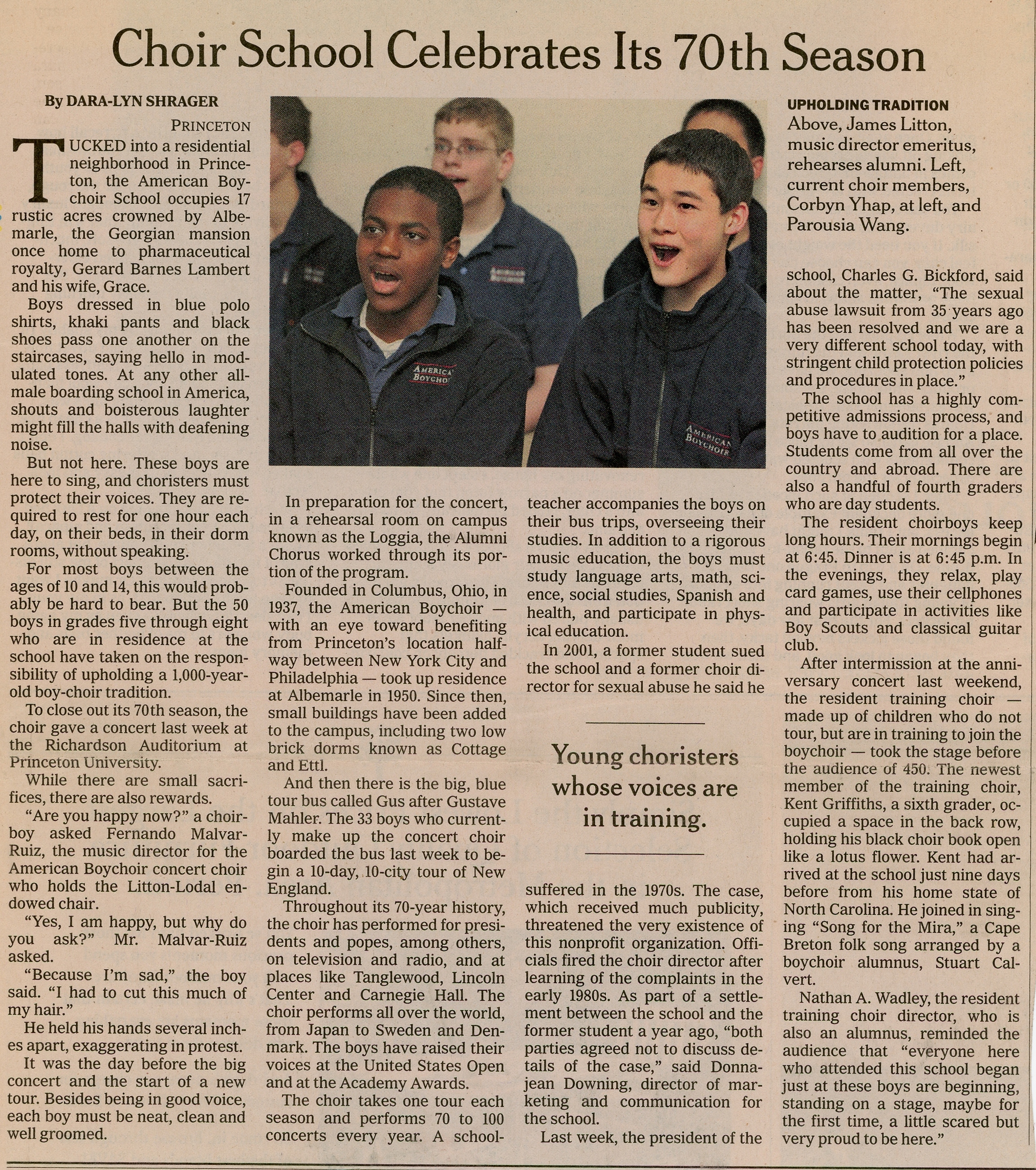 Entry Title Choir School Celebrates Its 70th Season Date Sun, 04/06/2008 - 00:00 Archive Type Article Photo Photographs Relevant Parties James Litton Address The New York Times New York, NY United States Archive Box Number ABS-012 Add new comment Your name Email Subject Comment About text formats Restricted HTML Allowed HTML tags: <a href hreflang> <em> <strong> <cite> <blockquote cite> <code> <ul type> <ol start type> <li> <dl> <dt> <dd> <h2 id> <h3 id> <h4 id> <h5 id> <h6 id> Lines and paragraphs break automatically. Web page addresses and email addresses turn into links automatically. CAPTCHA