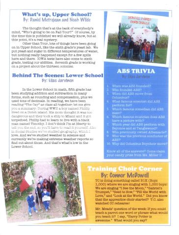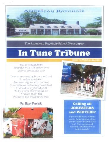 Entry Title In Tune Tribune ABS newspaper issue 2 Date Mon, 10/24/2011 - 00:00 Archive Type Document Photo Photographs Address The American Boychoir School 19 Lambert Drive Princeton, NJ United States Archive Box Number ABS-012 Add new comment Your name Email Subject Comment About text formats Restricted HTML Allowed HTML tags: <a href hreflang> <em> <strong> <cite> <blockquote cite> <code> <ul type> <ol start type> <li> <dl> <dt> <dd> <h2 id> <h3 id> <h4 id> <h5 id> <h6 id> Lines and paragraphs break automatically. Web page addresses and email addresses turn into links automatically. CAPTCHA