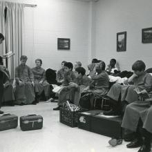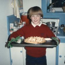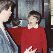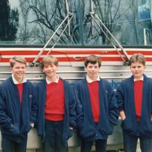 Boys, wearing blue coats and red scarves, gathered for a photo outdoors