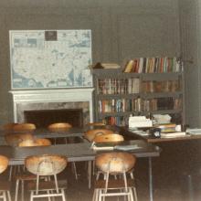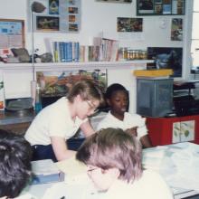 Boys, wearing white polo shirts, doing schoolwork in classroom