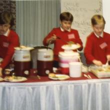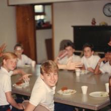 Boys, wearing white polo shirts, sitting at a table having a meal