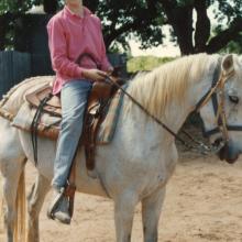 Dark-haired boy sitting with the Mackinac Bridge in the background