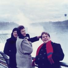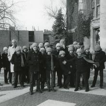 Dr. Litton and boys, wearing winter coats, standing outside of a building