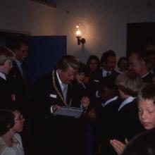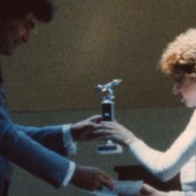 Boy with brown hair wearing white turtleneck receiving a trophy