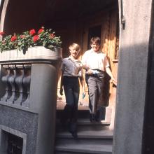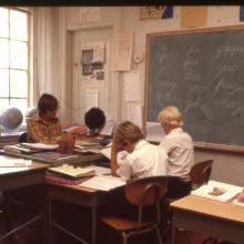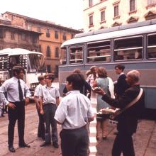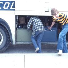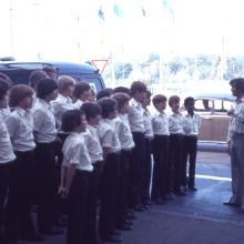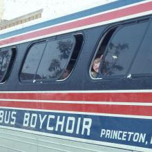 Boys loading or unloading luggage from the Columbus Boychoir bus