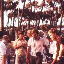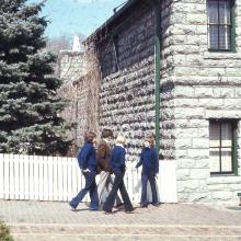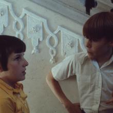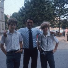 Two boys wearing white dress shirts standing outdoors with a dark-haired man