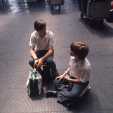 Two boys with brown hair wearing white dress shirts sitting in an airport