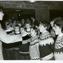 Boys, wearing red turtlenecks, gathered with Herb Hobler and three other adults