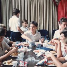 Dr. Litton standing by boys, wearing white polo shirts, eating