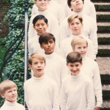 Boys, wearing white turtlenecks, standing on an outdoor staircase at Albemarle