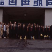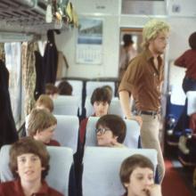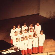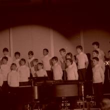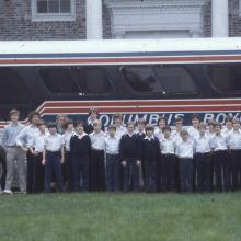 Boys wearing white dress shirts standing beside the Columbus Boychoir bus