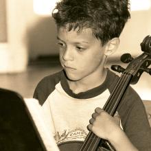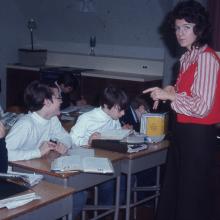 Boys wearing white turtlenecks sitting at desks in a classroom; dark haired woman teaching