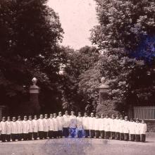 Group photo of boys wearing vestments lined up at the front entrance to Albemarle estate