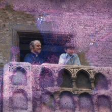 Boy wearing a blue dress shirt on a balcony with a clergy member