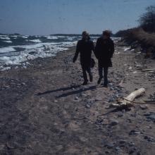 Boys wearing overcoats walking on a beach