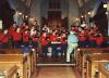 The choir wearing red sweaters performing in a church