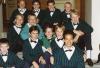 Boys wearing green and black striped jackets for a performance