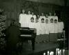 Boys, wearing blue turtlenecks, standing outside of the J F Kennedy Center for the Performing Arts