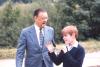 Boy wearing a blue dress shirt on a balcony with a clergy member