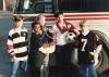 Boys standing beside the Boychoir bus and holding a Valentine gift basket
