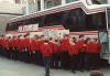 Boys standing beside Boychoir bus which is decorated with hand-made signs
