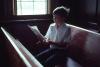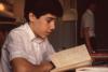 Boy with dark hair reading a book in his bed