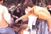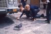 Boys wearing dark sweaters feeding a bird on a city sidewalk