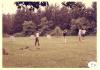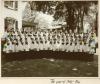 Early photo of boys wearing white choir surplices singing in front of stained glass window