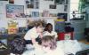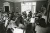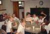 Boys, wearing white polo shirts, doing schoolwork in classroom