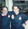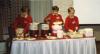 Boys, wearing white polo shirts, sitting at a table having a meal