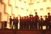 Choir, wearing vestments, performing on stage
