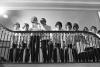 Boys wearing vestments and singing while on the staircase in the Grand Hall of Albemarle mansion