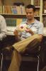 Boy with dark hair wearing name tag holding a paper with first aid symbol