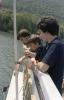 Two boys, one with light hair and one with dark hair standing with dark haired man wearing glasses on deck of Hiawatha Riverboat in Pennsylvania