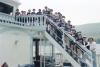 Boys and man with dark hair lined up on an outdoor staircase on the Hiawatha Riverboat; Pennsylvania