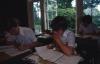 Boys wearing white button down shirts sitting at desks doing school work