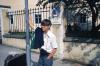 Boy with dark hair and glasses wearing white button down shirt standing by a pole with suitcases