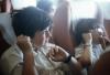 Two dark haired boys, one with wire rim glasses, wearing white button down shirts sitting on bus or airplane